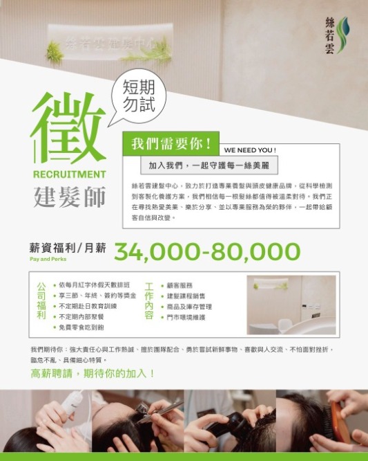 《絲若雲台北旗艦店徵才中》我們正在找尋熱愛美業、樂於分享、並以專業服務為榮的夥伴,除了有良好的工作環境,也提供學習與成長空間,歡迎有美業相關經驗的你來挑戰高薪!